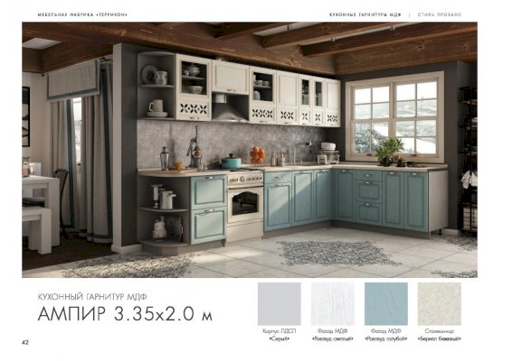 Хотите готовить и проводить время на кухне с удовольствием? Укомплектуйте помещение красивой и удобной мебелью — закажите гарнитур «Ампир»! Комплект эстетичен и функционален. В него входят все необходимые для создания идеальных условий элементы. Холодные оттенки поддерживают праздничное, романтическое настроение. Немного гламура в обстановку вносят прорезные орнаменты на дверцах подвесных шкафчиков.