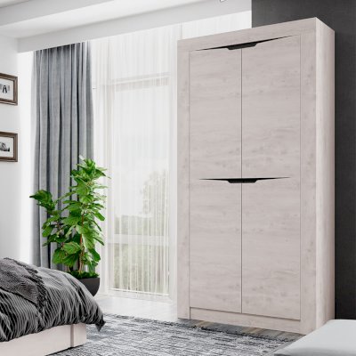 Двустворчатый распашной шкаф «Леонардо» с просторной антресольной полкой для хранения головных уборов, горизонтальной хромированной штангой для плечиков и нижней полкой, в которой удобно хранить коробки с обувью, выдержан в общей стилистики коллекции. Сборка универсальна.