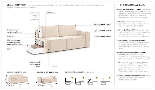 Брутальный диван с минималистическим дизайном и комфортной посадкой украсит современный интерьер, отлично подойдет для зонирования комнаты. Прямые линии силуэта подчеркиваются двойным декоративным кантом. Посадочное место образовано из двух частей, которые раскладываются независимо друг от друга и при необходимости прямую конфигурацию дивана можно менять на угловую. Инновационная система раскладки состоит из трех роликов на металлических направляющих, легко превращает диван в спальное место, исключает перекосы и деформацию короба. Металл в направляющих повышает их надежность и сопротивляемость нагрузкам. Независимый пружинный блок в основании дивана гарантирует комфортный отдых.