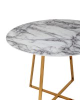 Лаконичный обеденный стол для кухни. Круглая столешница с рисунком белого мрамора выполнена из МДФ - прочного, экологически безопасного материала, который устойчив к перепадам температур и повышенной влажности. Поверхность столешницы декорирована рисунком белого мрамора, который идеально сочетается с металлическими ножками. Защитные подпятники на ножках предотвращают порчу напольного покрытия.