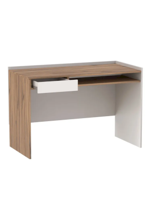 Прямой письменный стол имеет один выдвижной ящик (возможно правое и левое его расположение) и открытую нишу (полку) для хранения. По двум сторонам столешницы расположены невысокие бортики.