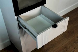 Шкаф оснащён надёжной металлической ручкой и имеет удобное внутреннее наполнение: надёжные полки за стеклянной и глухой дверцами, а также выкатной ящик. Это позволяет рационально использовать пространство.