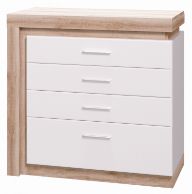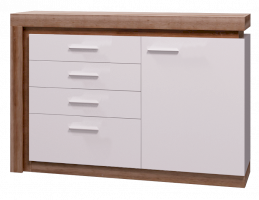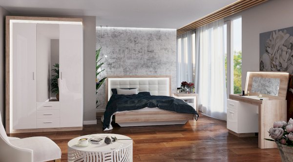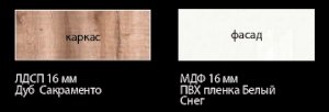 - Коллекция представлена в следующем цветовом решении: Корпус ЛДСП 16 мм  в декоре «Дуб Сакраменто» и фасад МДФ 16 мм в декоре  «Белый снег глянец»